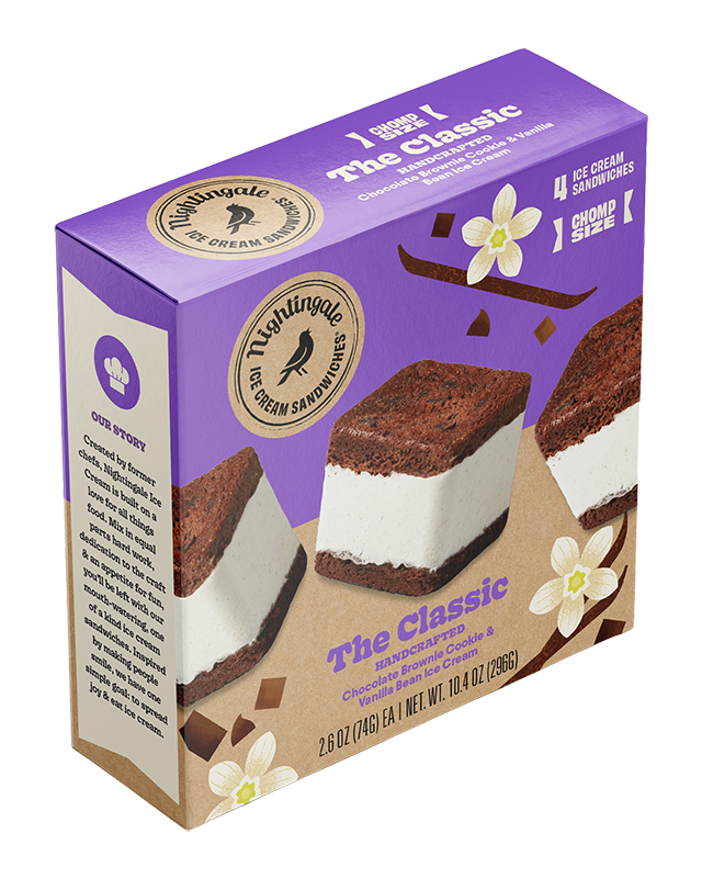 You can almost hear the ice cream truck tune when you unwrap this nostalgic treat. Inspired by the ice cream sammie we all grew up with but so much better…. We take our chewiest, chocolate brownie cookie and sandwich it around a thick and, creamy layer of our vanilla bean ice cream that is peppered with all the real vanilla bean flecks. Some things are classics for a reason and this is one you won’t be able to stop eating.